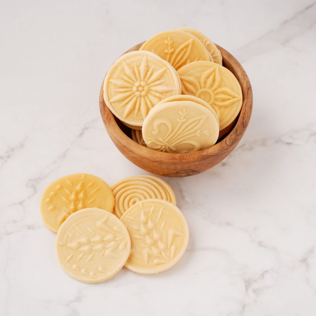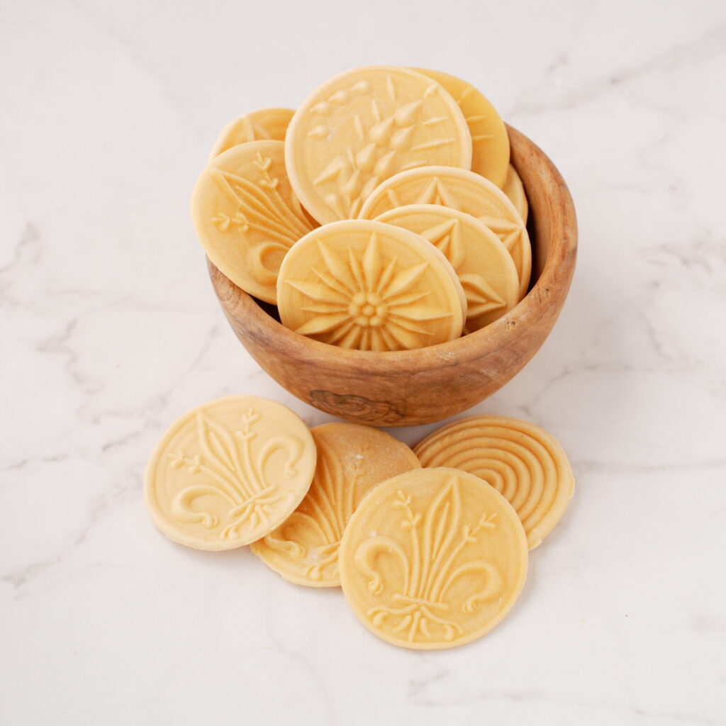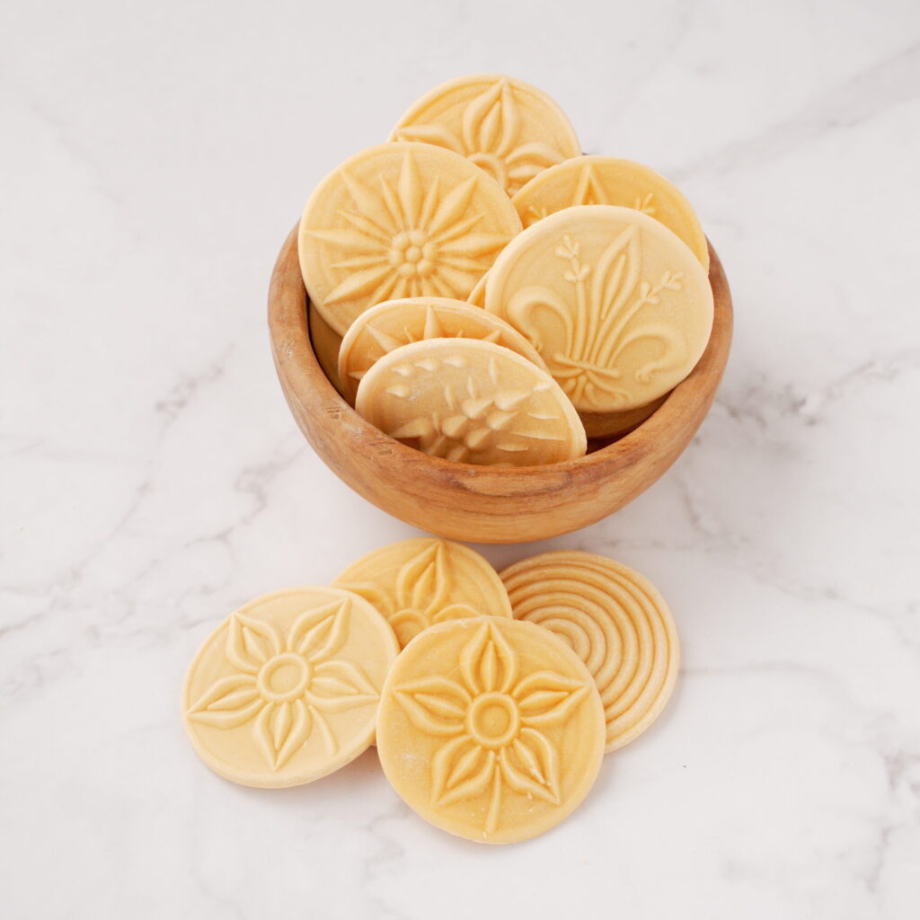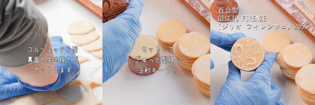 粉の香りとともに、木の型を押すと現れる繊細な紋様。