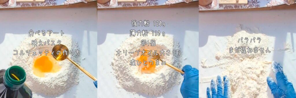 真ん中に卵・水・オリーブオイルを入れて、フォークで少しずつ粉を崩していきます
